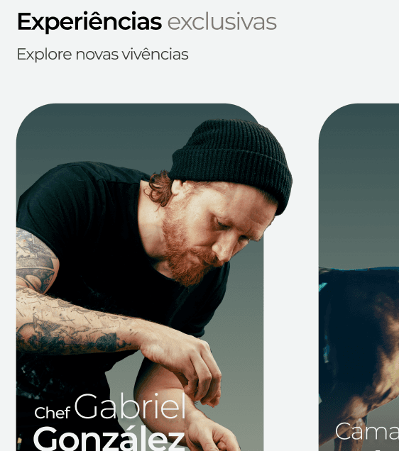 Principalmente na tela inicial os cards das experiências tem pouco destaque para as imagens, mas elas poderiam ter mais destaque.